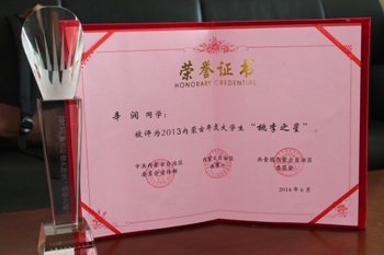 2013内蒙古年度大学生“桃李之星”评选活动组委会对我院辛润同学的颁奖评语是:“智慧是船,挑战是他的风帆,在通宵达旦中掌舵,在苦思冥想中航行。梦想是岸,奋斗是他的方向,在实验推理中遨游向前,在演算论证中展翅长空。苦中求学即是乐,辛苦勤奋润人生!”