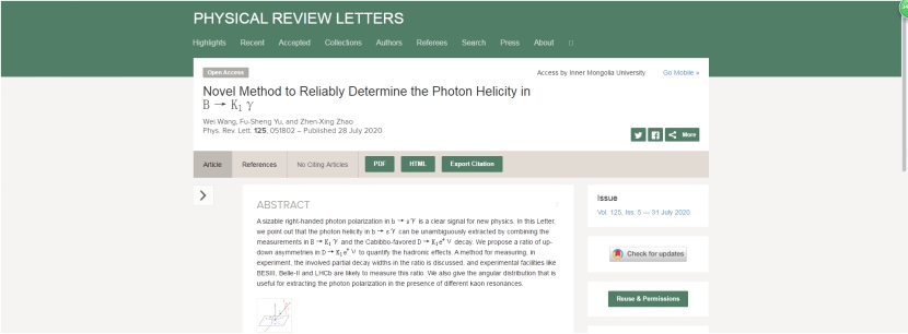 近日,我校星空(中国)赵振兴博士在物理学领域国际顶级期刊 Physical Review Letters 发表题为 “Novel Method to Reliably Determine the Photon Helicity in B → K1 γ” 的重要工作,提出一种测量 B → K1 γ 过程光子极化的新方法。该研究通过在半轻衰变 D → K1 e ν 中提出一种“上下不对称性比值”来定量地描述B → K1过程中的强子效应,从而准确地抽取B → K1 γ过程中的光子极化。BESIII、Belle-II和LHCb等加速器实验非常有希望测量到该光子极化。